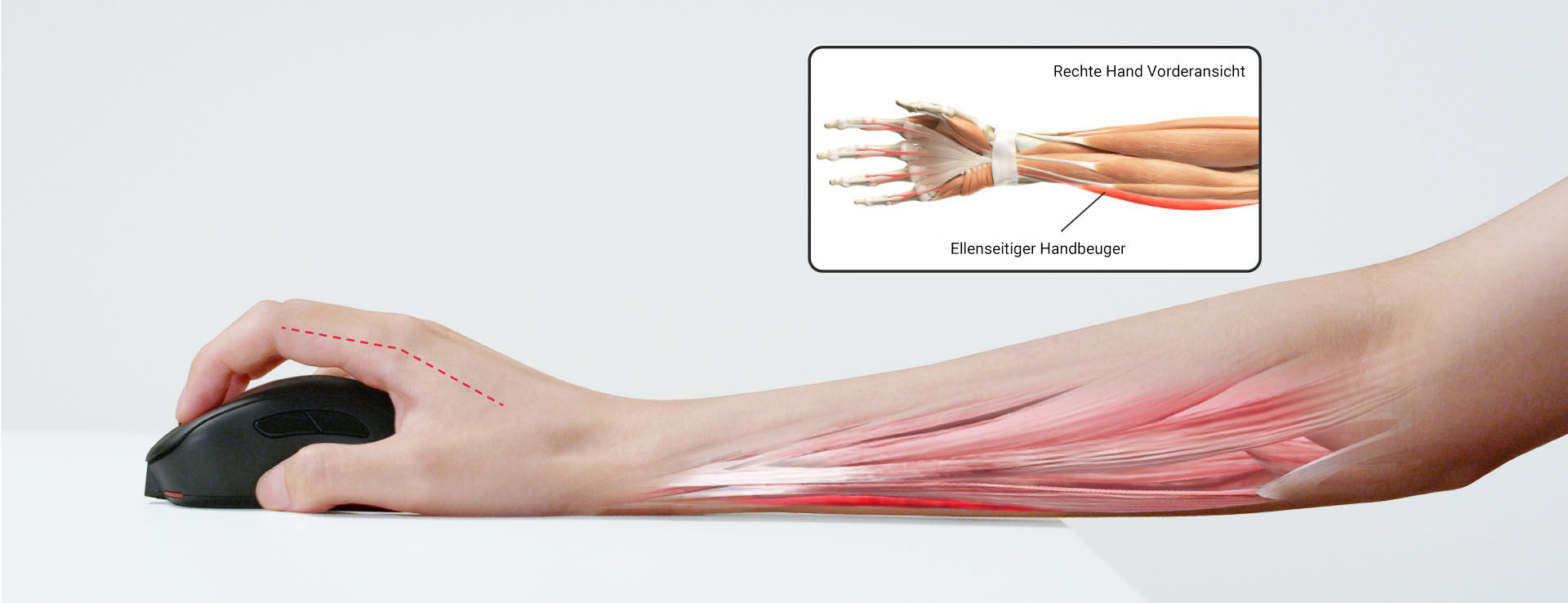 Die klassische Form der EC hat nicht zu viel Kontakt mit der Handfläche und eignet sich für verschiedene Griffarten mit bequemer Haltung. Reduziert die Ermüdung des ellenseitigen Handbeugers (Musculus flexor carpi ulnaris (FCU)) beim schnellen Klicken